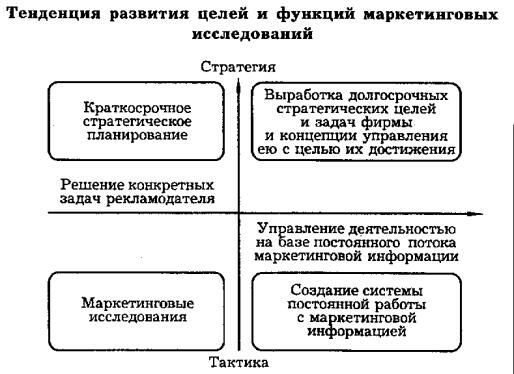 В настоящее время наблюдаются изменения целей и функций маркетинговых исследований. Эпизодические исследования, помогающие найти ответы на конкретные вопросы, стоящие перед рекламодателем, не дают достаточного количества информации для принятия радикальных стратегических решений. При ужесточающейся конкуренции производителям изделий и услуг приходится осуществлять постоянное отслеживание (мониторинг) рынка в целом с учетом всего разнообразия рыночных факторов. Только в этом случае появляется возможность реального перехода от тактического принятия решений к стратегическому. Если на базе эпизодических маркетинговых исследований осуществляется лишь краткосрочное стратегическое планирование сбытовой и как ее составляющей рекламной деятельности, то на основе постоянно функционирующей системы получения, анализа и применения маркетинговой информации появляются возможности разработки долговременных стратегических целей и задач, стоящих перед производителем или коммерческой структурой и создания концепции управления его или ее деятельностью с целью их достижения.