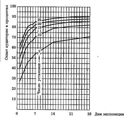 Что касается наружной рекламы, для нее существует показанная на рис. 25 зависимость между временем воздействия, числом установок, на которых размещена реклама, и охватом целевой аудитории.