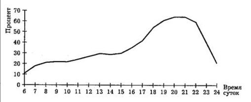 Представление о том, какое телевизионное время лучше использовать для рекламы, дает график на рис. 24, показывающий, какой процент владельцев телевизоров в какое время суток проводит время у экранов телевизоров (естественно, цифры меняются в зависимости от времени года, состояния общества, событий, но в целом тенденция сохраняется).