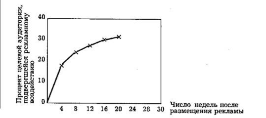 При проведении рекламной кампании приходится учитывать, что проникновение рекламного обращения в целевую аудиторию подчиняется закономерности, выраженной в графике на рис. 23; оно более эффективно в начальный период рекламной кампании.