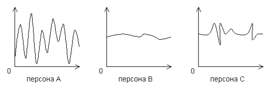 Мы видим, что А – это скорее всего легко возбудимый холерик, В – флегматик, С – сангвиник и т.п. Поэтому графики, в общем-то, можно систематизировать по характерным особенностям поведения (перепадам эмоционально-психического состояния). С точки зрения дианетики, именно этим по сути дела и занимаются психологи.