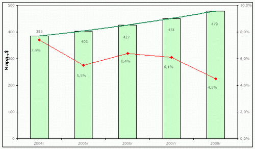 График 1. Расходы на рекламу в мире в 2004 – 2008 (прогноз) гг., темпы прироста мирового рекламного рынка.