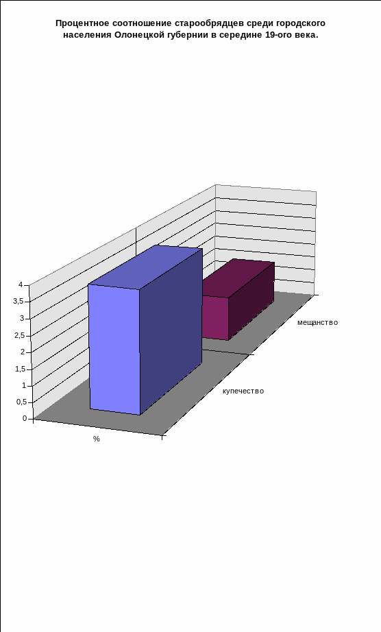 Среди старообрядчества помимо сельского, было и городское население. В Олонецкой губернии основной частью городского населения были мещане и купцы. Проведя аналогичные расчеты, я прихожу к выводу, что основной частью старообрядчества среди городского населения являлись купцы. Как известно, купечество - это более зажиточный слой, чем мещанство.