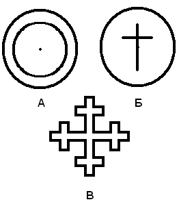 Первые символические изображение солярного культа, связанного с плодородием почвы и урожайности, встречаются в позднем неолите и раннем бронзовом веке. Они несут в себе одновременно магические представления и эстетические переживания: это концентрические окружности на донцах глиняной посуды (А), многолучевые изображения, кресты, вписанные в круг (Б), многоконечный крест – достаточно популярный элемент древней вышивки (В).