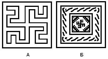 | Свастика в традиционных мотивах вышивки: А – России, Б – Индии |