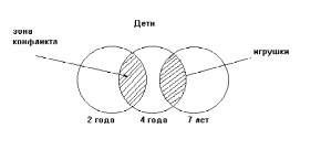 Конфликты между детьми, связанные с обладанием вещами и игрушками, возникают, когда эти границы пересекаются, т.е. несколько детей “кладут глаз” на одну и ту же игрушку или один из детей пытается расширить свои границы путем экспансии (захвата) чужих игрушек. Подтверждением могут стать результаты длительного наблюдения за тремя мальчиками двух, четырех и семи лет. Было замечено, что наибольшее число конфликтов, связанных с агрессивным поведением, наблюдалось между младшим, старшим и средним ребенком, в то время как между младшим и старшим конфронтация была минимальная. Обратил на себя внимание и тот факт, что конфликты возникали только по поводу обладания определенными игрушками. Удивительно, что были игрушки, вокруг которых совершенно не возникало конфликтов. Эту ситуацию можно проиллюстрировать следующим рисунком: