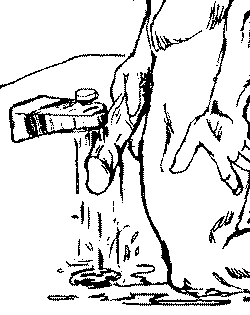 Г) Обильно смажьте ствол члена своим излюбленным смазочным средством (крем, лосьон, вазелин, масло). Соедините большой палец с указательным пальцем и обхватите этим "кольцом"ствол вашего члена у самого основания. Крепко его сожмите, и вы почувствуете под пальцами, как там забьется кровь. Из-за того, что она попала в ловушку и не может вернуться назад, ваш член начнет распухать. Разожмите пальцы. Потом повторите это упражнение, сжимая в кольцо двумя пальцами различные части ствола. Каждую часть нужно сжимать не дольше 3--5 секунд и переходить к следующей. Эти сжатия увеличивают поток крови к пещеристым телам. Со временем эти пространства увеличиваются и могут принимать больший объем крови, удерживая его в себе. Давление на ствол члена не должно вызывать у вас неприятных ощущений. Время процедуры -- 1--2 минуты.
