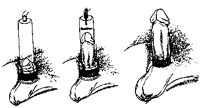 Предостережение. Особую осторожность при начале вакуумного процесса должен проявлять новичок. При излишнем старании можно вызвать"сыпь", - безвредные, красные, размером с булавочную головку кровоизлияния - как на головке члена, так и на его стволе. Эти безболезненные вначале разрывы мелких капилляров на члене могут причинять затем острую боль при дальнейшем использовании вакуумного аппарата. Обычно они исчезают через несколько дней. Однако продолжение интенсивного применения вакуума лишь усилит такую сыпь и через несколько недель от нее может даже потемнеть весь ствол. Если это произойдет, то вам придется отложить на несколько месяцев эту процедуру, пока член не придет в норму.