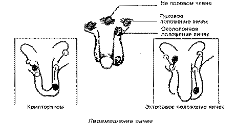 Если к моменту рождения мальчика одно или оба яичка не опустились из забрюшинного пространства в мошонку, речь идет об аномальном состоянии, которое называется крипт орхизм. Случается также, что при передвижении яичко отклоняется от назначенного пути и возникает так называемое эктоповое положение яичка. Эта ситуация также ведет к крипторхизму. Если педиатр путем пальпации не может определить положения яичка после рождения, повторное обследование проводится в течение двух первых месяцев жизни. Если и тогда не будет отмечено опущение яичек, следующий осмотр лучше всего проводить в конце первого года жизни. При благоприятных обстоятельствах к этому времени может произойти спонтанное опущение яичек.