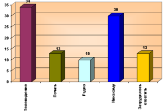34% респондентов при ответе на данный вопрос говорят, что из средств массовой информации больше всего доверяют телевидению. 13% опрошенных ответили, что доверяют печатным СМИ. 10% принимавших участие и исследовании больше доверяют радио. 30% участников опроса не доверяют ни одному из средств массовой информации. Затруднились ответить на заданный вопрос 13% респондентов.