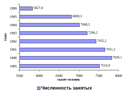 Снижение уровня занятости в 90-х годах отчетливо видно на рисунке 7, построенном на основе данных таблицы 8.