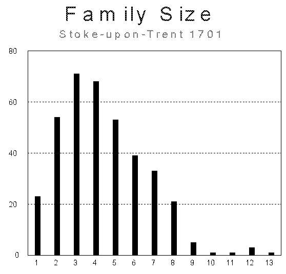 Средний показатель численности семей показывает, что в среднем размер семей в каждом из районов не превышал 4 человек. Имелось 23 человека-одиночки, а в одной из семей было аж тринадцать людей. Работа в гос. архиве в Кембридже по исследованию истории населения и социальной структуры населения Великобритании говорит о том, что размер семей в Стоук-на-Тренте заметно не отличался от показателей в других переписях округа, выполненных в Англии и Уэльсе в это время. Средний размер семей в Стоук-на-Тренте, ~4.4 людей на семью, почти не отличается от цифры, зафиксированной в Лондоне в 1662-1712, составившей 4,3 человека на семью. Возможно, наиболее интересным открытием стало то, что основным типом семьи, преобладавшим в до-индустриальной Англии, был простейший тип семьи, состоявшей из Отца, Матери и детей. Большие же семьи, состоявшие ещё и из внуков, дядей, тётей, бабушек и дедушек, были сравнительно редкими, хотя много семей содержали квартирантов и служащих. Детальный анализ переписи показывает нам, что это было характерно и для Стоук-на-Тренте тоже. Приблизительно 70.2 % семей составляли простейшие семьи и только 13.9 % семей содержал три поколения.
