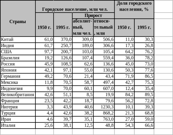 Сказанное в первую очередь относится к странам с низкой в недавнем прошлом долей городского населения и с наиболее высокими темпами прироста численности горожан в 1950-1990 гг., такими как Нигерия (её столица Лагос за этот период выросла почти в 27 раз и, по прогнозам демографов ООН, к 2000 г. выйдет на 8-е место среди агломераций мира), Турция или Иран, а также к странам, обладающим наибольшей «городской массой» с высокими темпами её прироста в этот период – Китай, Индия, СССР, Бразилия, Мексика, Индонезия.