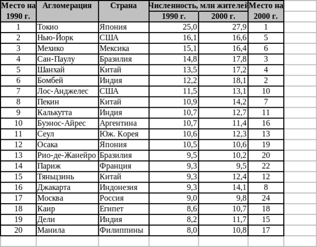 * Прогноз. В 2000 г. на 9 место выйдет Лагос (Нигерия – 13,5 млн чел.), на 14 место – Карачи (Пакистан – 12,1 млн чел.), а покинут список два последних представителя Европы – Париж и Москва.