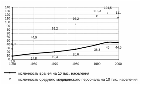 Данные рис. 2 показывают, что в российском здравоохранении наметилась тенденция к сокращению численности среднего медицинского персонала. Это объясняется, прежде всего, недостаточно высокой оплатой труда данного вида медицинских работников. Такая ситуация осложняет и замедляет лечебный процесс, что негативно сказывается на качестве медицинского обслуживания.