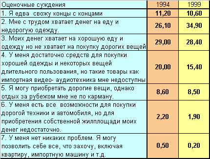 По данным опроса студентов 3 курсов 8 ВУЗов Екатеринбурга и Нижнего Тагила (N-994, выборка квотная, многоступенчатая), проведенного совместно кафедрами социологии УГТУ(Екатеринбург) и НГПИ(Нижний Тагил) и опубликованного в журнале «Социс» №12. 2000, материальное положение студентов далеко от приемлемого: