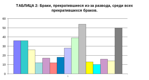 В нашей стране наряду со свободой брака существует и право супругов на развод. По статистике на 1990 год ещё в бывшем СССР ежегодно расторгалось примерно 930 тысяч браков (это приблизительно 1,5 % от их общего количества) и образовывалось 2788 тысяч новых семей. Таким образом, соотношение между браками и разводами составляет примерно 3:1. Но этот показатель различен в зависимости от места жительства и возраста людей. Так в больших городах разводов приходится больше чем в сельской местности. Так если посмотреть таблицу 2, мы видим, что наименьшее количество разводов приходится на регионы, где ещё сильны патриархально-религиозные традиции. Это среднеазиатские и кавказские республики.
