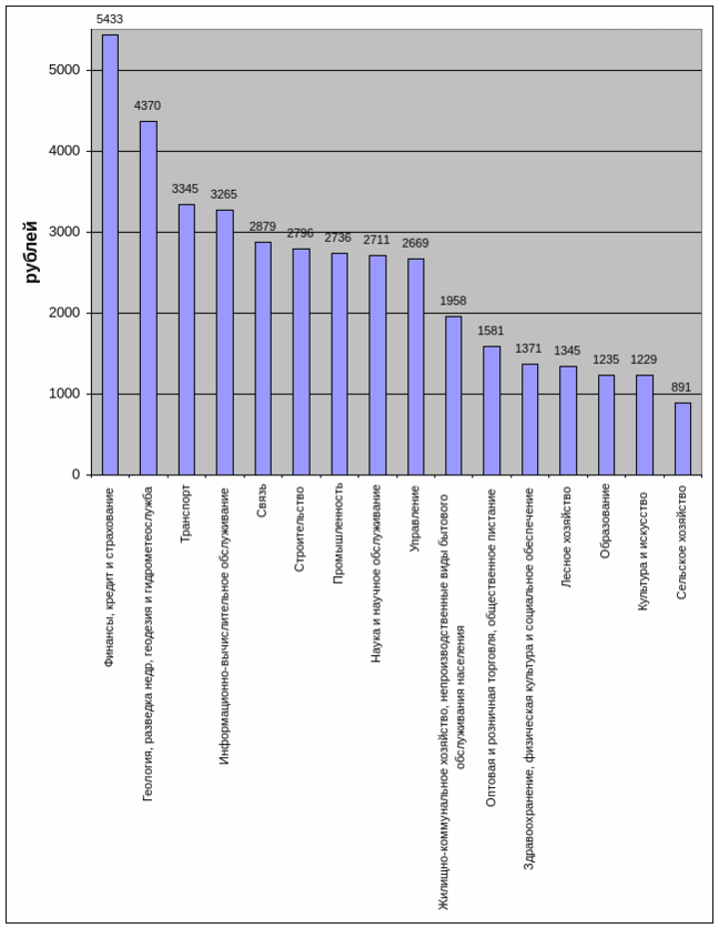 В 2000 г. наиболее высокая заработная плата сложилась у работников кредитования, финансов, страхования, геологии, транспорта и информационного обслуживания. Наименьшую заработную плату имели работники образования, культуры, сельского хозяйства.