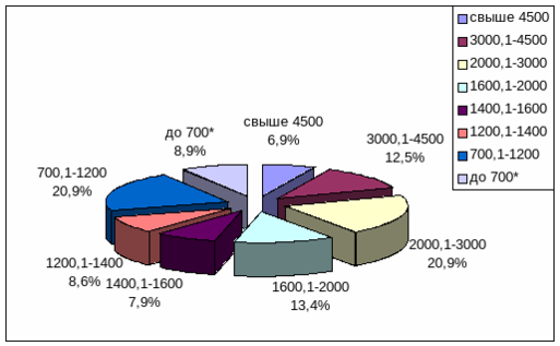Рис. 4. Распределение населения по величине среднедушевых денежных доходов в 2000 г., руб./мес.