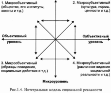 Парадигма психологического детерминизма возникла на основе учения австрийского психиатра З. Фрейда. Социальная реальность здесь рассматривается через призму извечного конфликта индивида и общества. Такие исходные постулаты фрейдизма, как доминирующая роль бессознательного, гиперсексуализм, эдипов комплекс, антропопсихологкческий редукционизм, впоследствии претерпели определенные изменения в теориях неофрейдизма (Э. Фромм, Д. Рисмен) и фрейдомарксизма (Г. Маркузе и Ф. Райх). Парадигма социально-исторического детерминизма связана с работами классиков марксизма. В этой парадигме социальная реальность рассматривается как совокупность отношений между людьми, складывающаяся в процессе их совместной деятельности. Несмотря на многочисленные попытки социологов, до сих пор не удалось создать единой общей социологической теории. Многие исследователи считают социологию мультипарадигмальной наукой, в которой сосуществуют различные парадигмы. Так, американский социолог Д. Ритцер разработал интегральную модель социальной реальности.[1, с. 84] Она представлена в виде взаимодействия четырех уровней социальной реальности: макрообъективного, макросубъективного, микрообъективного и микросубъективного (рис. 1.4).