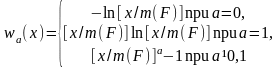 Для первого показателя - логарифмической меры расслоения - имеем функцию w(x)=-ln[x/(F)], которая дает название меры. Для нее весовая функция p имеет вид p[(Fi)]=1. а показатель расслоения