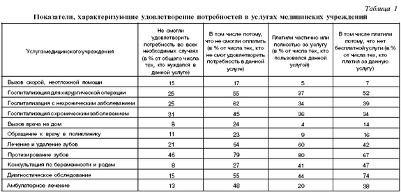 Основные параметры, которые получены по результатам опросов и характеризуют не только степень доступности услуг медицинских учреждений, но и причины отказа от них при наличии потребности, приведены в табл. 1. Эти данные свидетельствуют о том, что невозможность удовлетворения потребностей в медицинских услугах фиксируется по всем видам предоставляемых услуг (в том числе и при вызове скорой помощи), но размечается по степени распространенности. Зарегистрирована большая степень распространенности отказа при госпитализации, при этом половина этих отказов связана с невозможностью оплатить услуги медицинских учреждений. В условиях постоянного роста доли платной медицины и снижения доходов населения материальные причины отказа от медицинских услуг получают все более широкое распространение. Можно утверждать, что по отдельным видам услуг главной причиной отказа является невозможность оплатить пребывание в медицинских учреждениях.