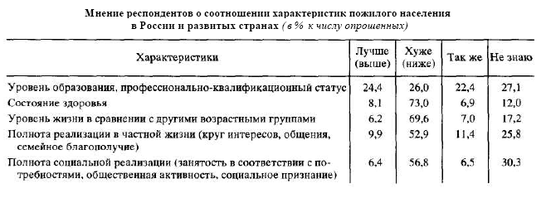 Небезынтересно, как выглядит образ пожилых в России на фоне их сверстников в развитых странах (табл. 2). Иными словами, данные опроса позволяют сделать вывод, что человеческий потенциал пожилых в России достаточно высок, во всяком случае, сопоставим с развитыми странами (исключая состояние здоровья), но степень его реализации, как в социальной, так и в частной жизни, значительно ниже.
