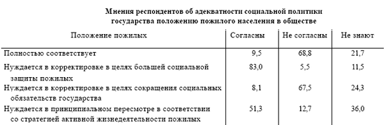 С учетом рассмотренных здесь аспектов жизни пожилых людей в России немаловажно посмотреть, как оценивают респонденты современную социальную политику и возможные направления ее развития (табл. 3). Лишь десятая часть опрошенных считает, что современная социальная политика соответствует месту и роли пожилого населения в обществе. Около 70% не согласны с этой точкой зрения, остальные - около четверти всех опрошенных - затруднились с определенным ответом. Таким образом, абсолютное большинство респондентов выступают за корректировку социальной политики.