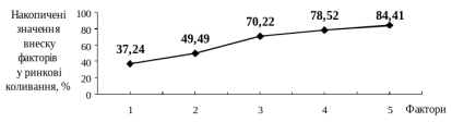 Проведене моделювання на основі методу головних компонент дозволило виділити з великої сукупності факторів лише декілька вагомих, а також дало можливість уникнути суб’єктивізму при визначенні таких факторів. До уваги було взято п’ять факторів (їхні власні числа більші за одиницю), які пояснюють 84,41% ринкових коливань (рис. 2). Для економічної інтерпретації після знаходження простої факторної структури в дослідженні використовувались лише ті факторні навантаження, значення яких більші ніж 0,7.