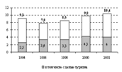 Согласно данным статистики, за последние 10—12 лет, миграционные процессы в России характеризуются следующими особенностями:— масштабы постоянных миграций постепенно уменьшаются (табл. 1), общее число зарегистрированных миграционных перемещений, как внутренних, так и внешних, сократилось более чем в два с половиной раза — с 6,3 млн в 1989 до 2,4 млн человек в 2001 г.;— доля внутренних миграций в общем объеме переселений (включающем также миграционный обмен со странами СНГ, Прибалтики и дальнего зарубежья) увеличилась с 65 до почти 90%;— в составе мигрантов преобладает население в трудоспособном возрасте, на долю которого приходится 3/4 от общего их числа (рис. 2); во всех потоках среди мигрантов преобладают женщины, главным образом за счет старшей возрастной группы;.