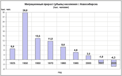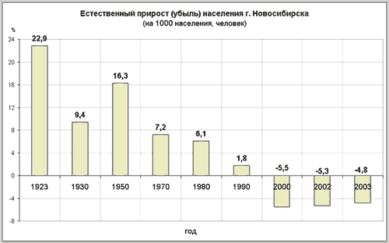 По представленным выше данным, важно заметить, что происходит изменение главной причины снижения численности жителей в городе Новосибирске. Если в 2001 году город “потерял” несколько тысяч человек из-за заболеваний социального характера и о механической убыли не могло идти и речи, так как в город прибыло более четырех тысяч человек, то в 2003 году механический прирост сменился на механическую убыль. И с каждым годом, из-за отсутствия эффективной миграционной политики, механическая убыль увеличивается…