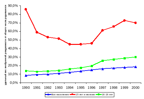 Существенно снизились социально‑политические, культурные, досуговые интересы молодежи, уровень ее общей культуры. Часть молодежи самоизолируется, уходит «в себя», в социальный вакуум, а это ограничивает ее способность активно включаться в новые общественные отношения, искать различные формы самозащиты и т.д. А главное – социальная бездеятельность рождает социальную безответственность. В качестве негативного примера можно сослаться на такое явление, как внебрачная рождаемость среди несовершеннолетних, доля которых в общем объеме внебрачных рождений в стране весьма велика (см. рис.3.5).