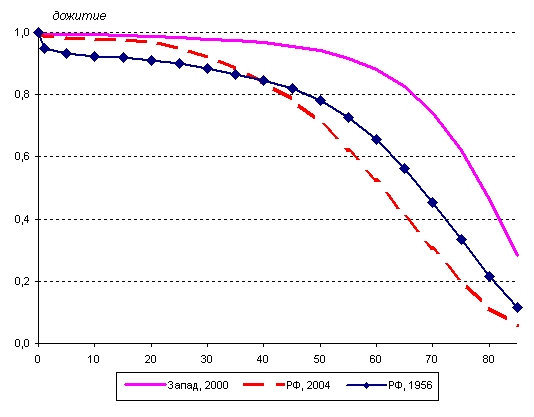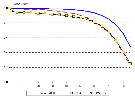 То, что Россия относительно молода на фоне большинства европейских государств отчасти связано с низкой продолжительностью жизни. Старение населения у нас происходит только «снизу», т.е. за счет низкой рождаемости. Снижение смертности вносит свой вклад в старение, во-первых, если больше людей доживает до старших возрастов, и, во-вторых, если увеличивается продолжительность жизни пожилых людей. При выполнении первого условия, в результате общего сдвига в возрастном распределении смертности к старшим возрастам, кривая дожития постепенно приближается к прямоугольной форме (ректангуляризация кривой дожития).