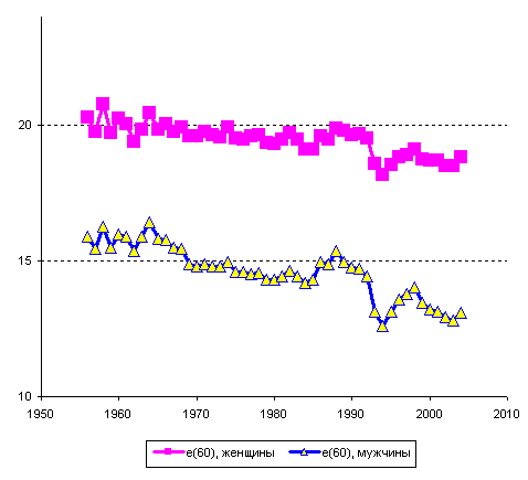 Рисунок 16. Продолжительность жизни мужчин и женщин в возрасте 60 лет. Россия, 1956-2004 гг. Источник: расчеты на основе данных Росстата