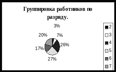 Группировка по разряду свидетельствует о том, что на данном промышленном предприятии персонал среднеквалифицированный, т.к. наблюдается наличие большего количества работников 4 и 5 разрядов чем работников 6 и 7 разрядов (соответственно 54% и 37%). Данные выводы отражены на рис.1.2.: