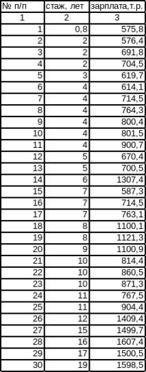 Ниже приведён пример обнаружения корреляционной связи между стажем (факторный признак) и заработной платой (результативный признак). В таблице 2.1 работники ранжированы по стажу.