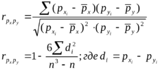 Ранги – порядковые номера единиц совокупности в ранжированном ряду. Ранжировать оба признака необходимо в одном и том же порядке от меньших к большим или наоборот. Если ранги единиц совокупности обозначить рх и ру, то коэффициент корреляции рангов примет следующий вид: