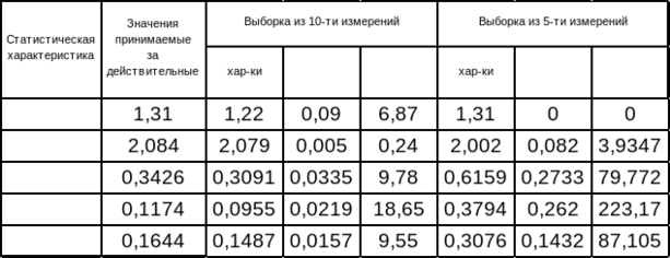 Вывод: При выборке N=10 среднеарифметическое значение имеет низкую погрешность, остальные значения погрешностей достаточно высоки (более 5%). При выборке N=5 среднеарифметическое значение также имеет низкую погрешность, остальные значения погрешностей высоки (более 50%), а дисперсия более 100%. В целом, можно заключить, что при N=10 меньших процент погрешностей, чем при N=5.