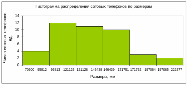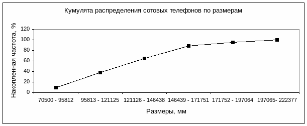 | Размеры, мм3 | Число cотовых телефонов , ед. | Число cотовых телефонов, % к итогу | Накопленная частота, % |