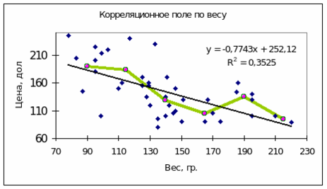Линейный коэффициент корреляции показывает,что отклонение весов от их средней величины 139,06 гр на величину 35,28гр в среднем по совокупности приводит к отклонению цены от 145,44 дол. на величину -0,59 от средне квадратического отклонеия 46,01 дол.