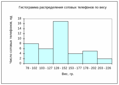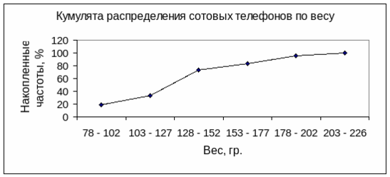 | Вес, гр. | Число cотовых телефонов , ед. | Число cотовых телефонов, % к итогу | Накопленная частота, % |