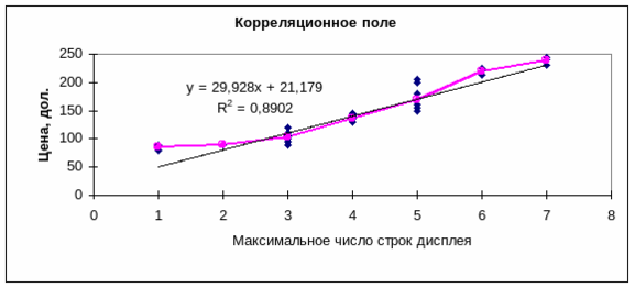 Линейный коэффициент корреляции показывает,что отклонение максимального числа строк дисплея от их средней величины 4,12 ед. на величину 1,45 в среднем по совокупности приводит к отклонению цены от 145,44 дол. на величину 0,88 от средне квадратического отклонения 46,02 дол.