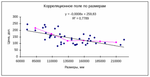 Линейный коэффициент корреляции показывает,что отклонение размеров от их средней величины 135117,7 мм3 на величину 35161,42 мм3 в среднем по совокупности приводит к отклонению цены от 145,44 дол. на величину -0,62 от средне квадратического отклонеия 46,01 дол.
