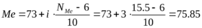 Медианный интервал – второй (73-76), т.к. это первый интервал, в котором величина накопленных частот больше 15.
