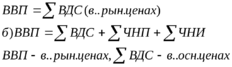 2) ВВП=ОТ+ЧНП+ЧНИ+ДНП+ВПЭ, где ОТ – оплпта труда, ДНП – дг.налони на продукт, ВПЭ – вал.прибыль экономики. ВПЭ=ВДС-ОТ+ЧНП, ЧПЭ=ВПЭ-ПОК, где ПОК – потребление осн.кап-ла. 3) ВВП=КП+ВП±(Э-И), где КП – конеч.потребление, ВП – вал.потребление, (Э-И) – сальдо внешнеэкон.деят-ти. Расходы на конечн.потребл-ние: 1) гос.учр-ний, обслуживающих дом.хоз-ва, 2) расходы гос.учр-ний, удовл-щих коллект.потреб-ти, 3) расходы ком.орг-ций, обслуж-щих дом.хоз-ва. КП=1)+2)+3). КП может быть опр-но как факт. конечное потребление. Вал.накопление осн.кап-ла: 1) приобретение осн.фондов за вычетом выбытия, 2) затраты на улучшение непроизв.мат.активов, 3) расходы в связи с передачей прав собст-ти на непроизвед.активы. Или вал.накопление = накопление осн.кап-ла + изм-ние запасов мат.обор.ср-в. Чистое приобретение ценностей – ст-ть поступлений драг.металлов, камней, коллекций и др. произведений изобраз.исскуства. Чистый экспорт товаров и услуг – разница между экспортом и импортом товаров и услуг.