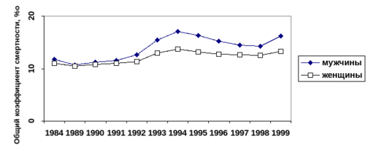 сверхсмертность мужчин. В 1999 г. продолжительность их жизни составила 59.9 лет (в 1997-м – 60.9 лет, в 1998-м – 61.34 года), что на 12.53 года меньше, чем у женщин, и на 3.56 года меньше, чем в 1991 г.
