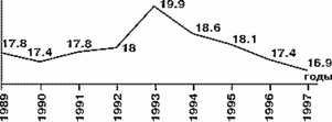чрезвычайно высокая в сравнении с другими развитыми странами младенческая смертность. Начиная с 1990 г. этот показатель возрастал: в 1991-м он достиг 17.4%, в 1992-м - 18.0%, в 1993-м - почти 20%. Затем начал медленно снижаться, составив в 1997 г. 16.9%
