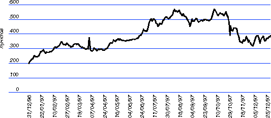 Во второй декаде октября 1997 г. произошла, после периода подъема на рынке, традиционная кратковременная корректировка рыночных показателей, а за ней - глобальный спад рыночной конъюнктуры. Его кульминация на российском фондовом сегменте была зафиксирована 28 октября, когда 14%-ное падение фондового индекса Hang Seng (Гонконг), 7%-ное (третье по величине с момента существования американского фондового рынка - с 1896 г.) снижение индикатора DJIA и глобальное падение конъюнктуры, зафиксированное на европейских биржевых площадках, сформировали панические настроения у участников отечественного рынка.