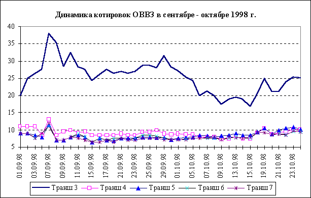 В конце сентября 1998 г. возобновилась тенденция к падению котировок ОВВЗ, в особенности это затронуло 3-ю серию со сроком погашения в марте 1999 г. (см. рис. 4). К середине октября ее цена упала с 25–30 до 17–20 процентов от номинала. Однако с середины месяца наметился некоторый рост котировок. В частности, к концу октября 1998 г. данный транш ОВВЗ котируется на уровне 25% от номинала, тем не менее, с учетом близости срока ее погашения доходность данной валютнономинированной бумаги находится на чрезвычайно высоком уровне (более 1000% годовых). Котировки остальных траншей ОВВЗ оставались в сентябре–октябре 1998 г. оставались относительно стабильными на уровне 7–10% от номинала.