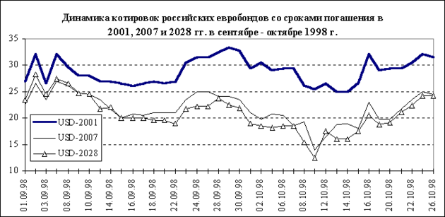 Динамика котировок российских валютных государственных ценных бумаг в сентябре – октябре 1998 г. находилась под сильным влиянием политических процессов в России и развитием процесса переговоров между Правительством РФ и иностранными инвесторами в отношении реструктуризации рублевых государственных ценных бумаг (ГКО и ОФЗ), замороженных августовскими решениями Правительства и ЦБ РФ.